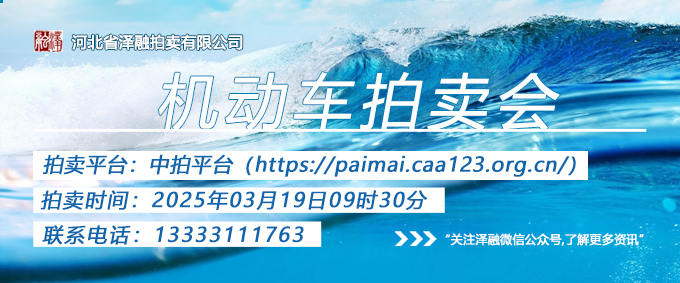 - 拍賣公告受委托,我公司定于2025年3月19日9:30在中拍平臺(https://paimai.caa123.org.cn/)公開舉行機(jī)動車拍賣會,不接受現(xiàn)場競拍。2025年3月17日、18日在標(biāo)的物所在地預(yù)展。有意競買者須交納競買保證金到我公司指定賬戶并請攜有效證件與我公司辦理競買報名手續(xù)…