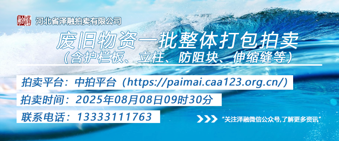 - 拍賣公告受委托,我公司定于2025年8月8日9:30在中拍平臺(https://paimai.caa123.org.cn)對“廢舊物資一批(含護(hù)欄板、立柱、防阻塊、伸縮縫等)”整體打包拍賣,拍賣標(biāo)的以移交時的實(shí)際現(xiàn)狀為準(zhǔn),不接受聯(lián)合體報名及現(xiàn)場競拍。2025年8月6日、7日在標(biāo)的物所在地預(yù)…